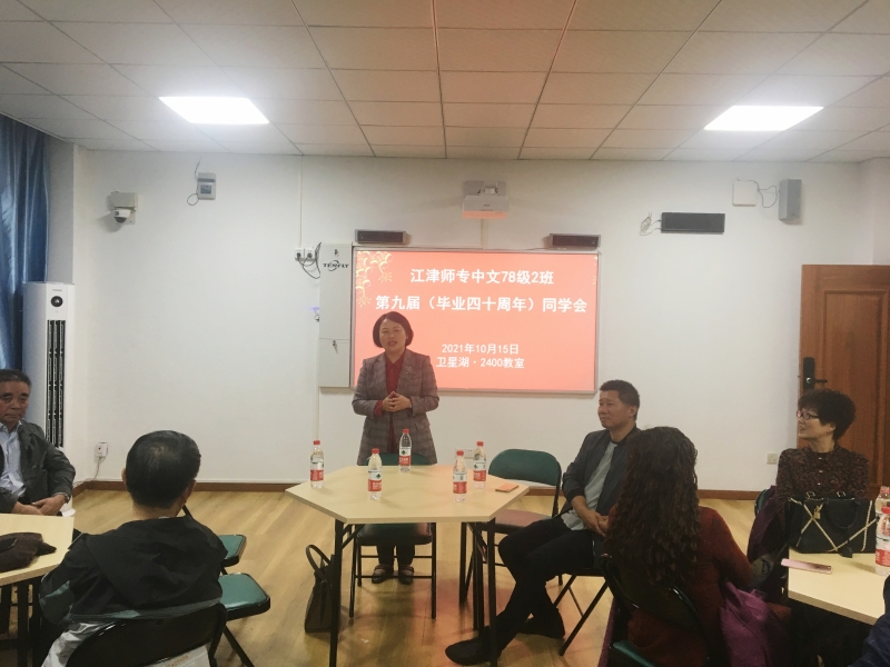 10月15日晚上,中文78级2班37名校友相聚母校卫星湖校区2400教室举行毕业四十周年座谈会,重温青春岁月,再叙同学情谊。文化与传媒学院院长、校友会会长李芹燕,党总支副书记、校友会副会长邱飞,以及中文78级2班校友参加座谈。原校图书馆支部书记蒋永平校友主持会议。