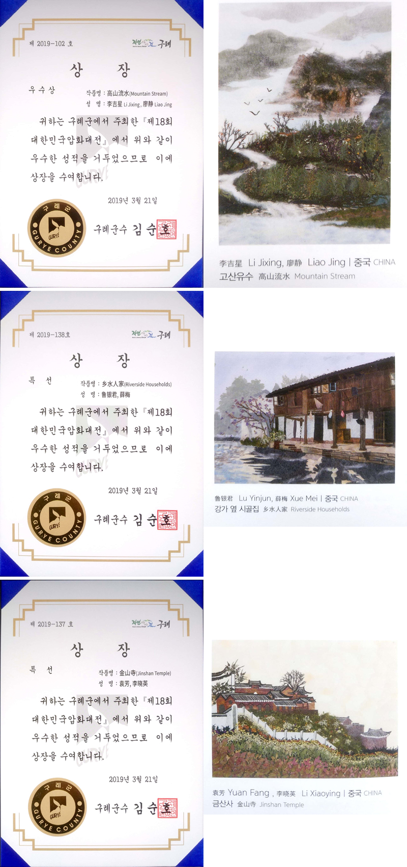 韩国国际压花比赛由韩国政府主办,邱礼郡政府和邱礼郡农业技术中心承办,该项比赛从2002年开始每年春季举办,至今已经连续举办了18届。该比赛每年吸引了来自中国、美国、俄罗斯、日本、韩国、乌克兰、波兰、台湾等多个国家和地区的压花专家及爱好者参赛,参赛作品主要以风景压花画为主,同时接收各种形式和风格的压花艺术作品。各国选送的作品经过照片审查及实物审查两次评选后最终评选出60幅获奖作品,这些作品在创作性、技术性以及独特性方面充分展示了作品的艺术性和价值。韩国政府非常重视此项工作,将压花技艺推向了文化和产业的高度发展。