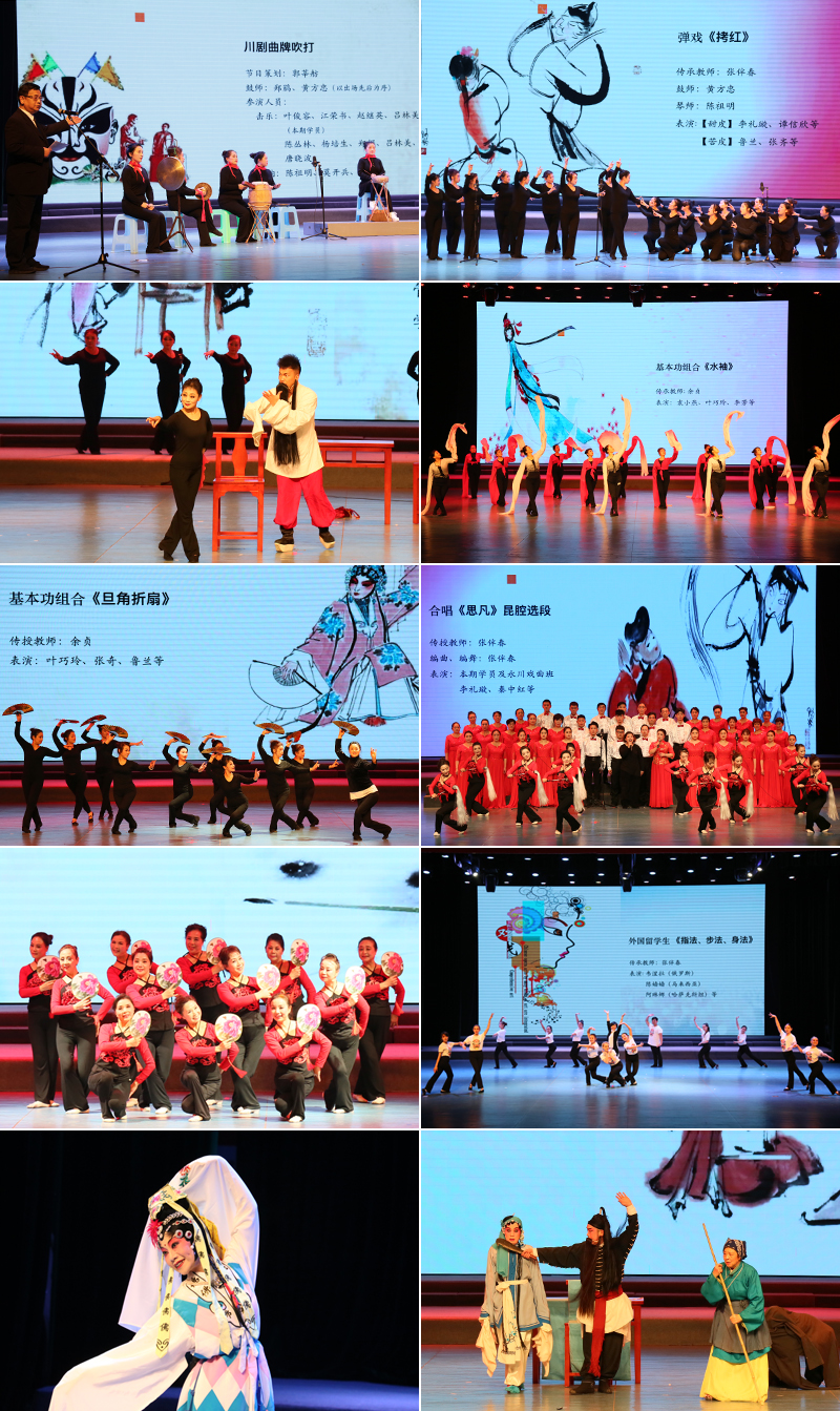 汇报演出中,中外学员以锣鼓、弹戏、胡琴、高腔等剧目和团扇、折扇、水袖等基本功表演完整地呈现了本次川剧传承人(群)培训的主要内容和成果。其中,张伴春老师指导的外国留学生指法、步伐、身法基本功表演惊艳全场、独放异彩,永川区川剧团表演的《杀狗惊妻》剧情精彩、演技绝妙。整场演出由taptap点点郭莘舫教授策划指导,演出吸引了全场观众,获得阵阵掌声。