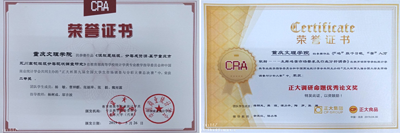 由taptap点点数学与财经学院杨树成、邬吉波两位教师指导,16级金融数学专业杨敏、曹珅麒、魏雨露、张毅、张丽萍5位同学共同完成的调研成果《混放是垃圾,分类成资源——基于重庆市永川区高校垃圾分类现状调查研究》,先后经历校赛、市赛,以重庆市第一名的成绩同西南交通大学、西南财经大学、重庆工商大学等高校会师西南片区赛,一路过关斩将,最终在全国总决赛中荣获二等奖。同时,由余亚江、骆小琴两位教师指导,16级金融数学蒋朝凤、熊莉,18级财务管理谭力丹、17级财务管理张渝、教育学院16级应用心理学陶罗5位同学共同完成的成果《“鸡”报千日晚,“蛋”入万家冠——生鲜鸡蛋市场需求及行业分析调查》荣获调研命题优秀论文奖。