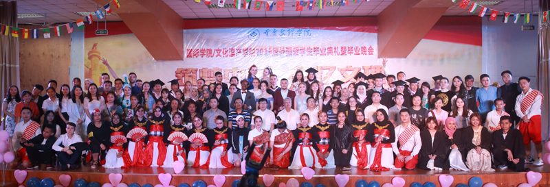 6月23日晚,“筑梦中国,情忆文理”——国际学院2019届外国留学生毕业典礼暨毕业晚会在红河校区A区活动中心三楼举行。学校党委书记孙泽平,永川区公安局出入境管理支队副支队长旷章建,重庆乐和乐都旅游有限公司人力资源部刘建军,学校文化与传媒学院院长李天福、软件工程学院党总支书记刘中胜,国际学院/文化遗产学院党支部书记沈远川、院长刘壮、副院长李景国,留学生家长代表,国际学院/文化遗产学院全体师生及学校学生主席团代表、各院学生代表等800余人参加了活动。毕业典礼由沈远川主持。