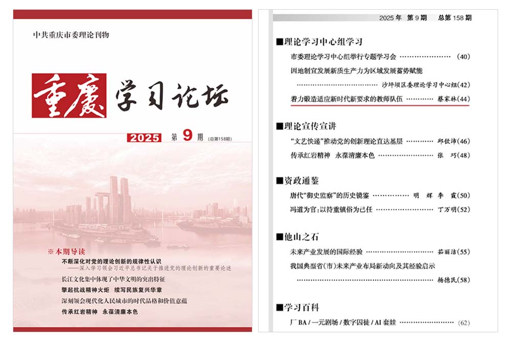 为深入学习贯彻习近平新时代中国特色社会主义思想,大力弘扬教育家精神,持续加强新时代高素质教师队伍建设。近日,《重庆学习论坛》刊发学校党委书记蔡家林撰写的理论文章