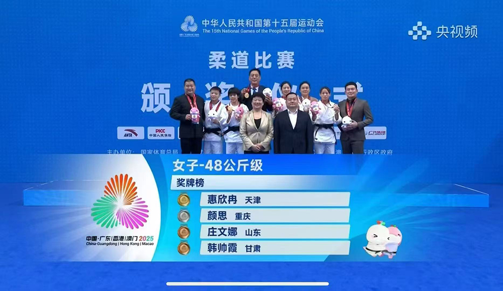 11月10日,在广东肇庆四会市体育中心举行的中华人民共和国第十五届全国运动会女子柔道48公斤级比赛中,taptap点点体育学院2022级运动训练专业学生颜思夺得银牌,这是重