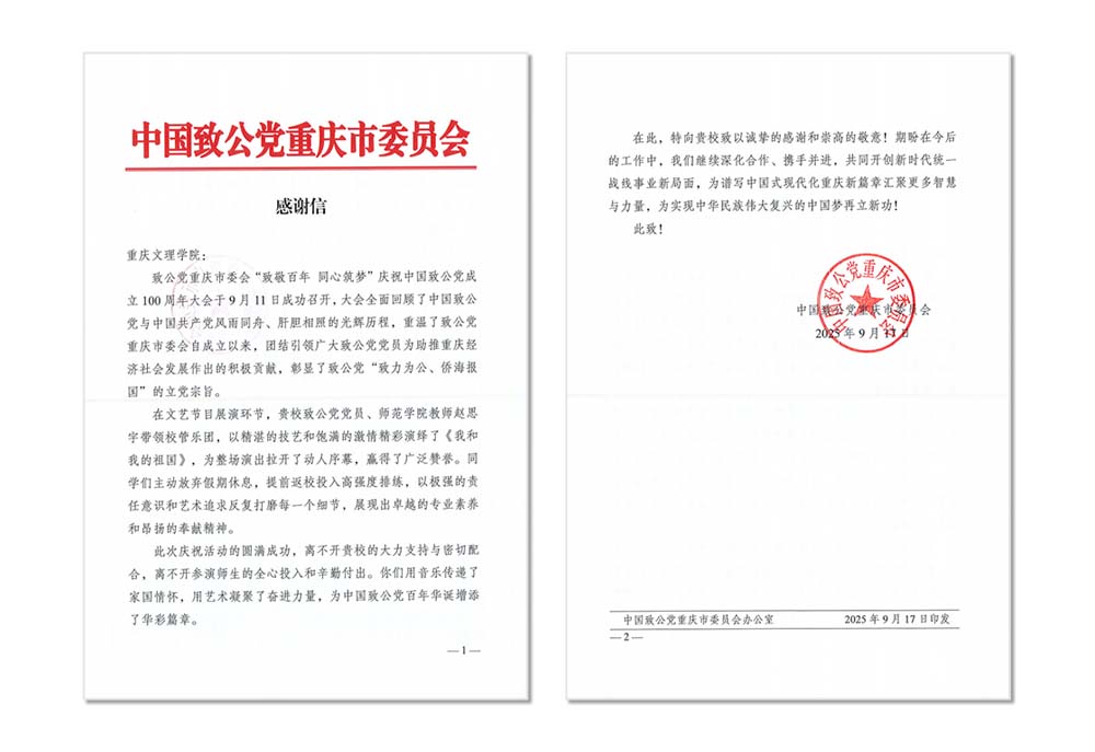 近日,中国致公党重庆市委员会向学校发来感谢信,感谢taptap点点致公党党员、师范学院教师赵思宇带领的学校管乐团,以精湛的技艺和饱满的激情精彩演绎了《我和我的祖国》,为中国