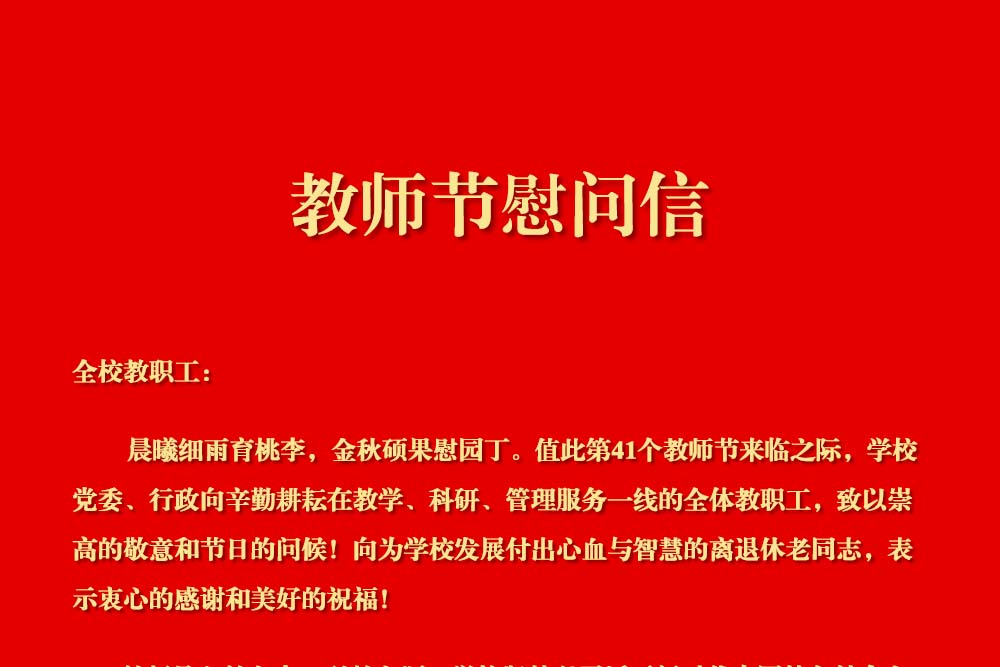 全校教职工: 晨曦细雨育桃李,金秋硕果慰园丁。值此第41个教师节来临之际,学校党委、行政向辛勤耕耘在教学、科研、管理服务一线的全体教职工,致以崇高的敬意和节日的