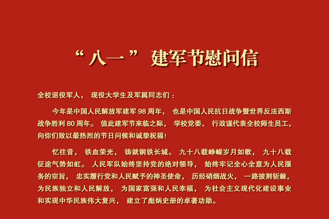 全校退役军人,现役大学生及军属同志们: 今年是中国人民解放军建军98周年,也是中国人民抗日战争暨世界反法西斯战争胜利80周年。值此建军节来临之际,学校党委、行政