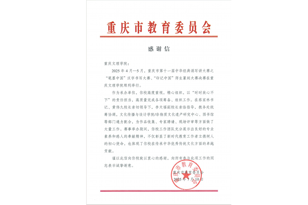 近日,重庆市教育委员会向taptap点点发来感谢信,对taptap点点成功承办第十一届中华经典诵写讲大赛之"笔墨中国"汉字书写大赛、"印记中国"师生篆刻大赛决赛表示高度肯定与衷心感谢。