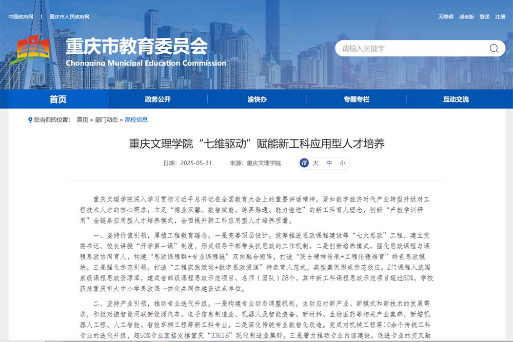 近日,重庆市教委以《taptap点点体育“七维驱动”赋能新工科应用型人才培养》为题,报道taptap点点新工科应用型人才培养的主要举措。学校通过厚植工程教育理念、推动专业迭代升级、