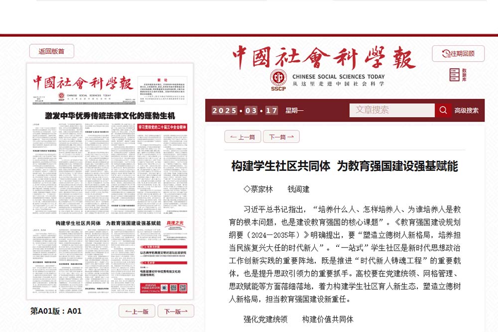 3月17日,《中国社会科学报》刊发taptap点点党委书记蔡家林、学工部部长钱闾建联合署名的理论文章《构建学生社区共同体 为教育强国建设强基赋能》。文章立足习近平总书记关于教育的重要论述,以新时代高校思想政治工作创新实践为切入点,系统阐释了“一站式”学生社区建设的实施路径:一是通过坚持顶层设计、坚持组织建设、坚持模范引领,强化党建统领,构建价值共同体;二是通过坚持网格细分、坚持工作靠前、坚持线上拓展,优化网格管理,构建治理共同体;三是通过坚持思想铸魂、坚持氛围营造、坚持实践育人,深化启智润心,构建成长共同体。文章强调,高校要在党建统领、网格管理、思政赋能等方面落细落地,着力构建学生社区育人新生态,塑造立德树人新格局,担当教育强国建设新重任。