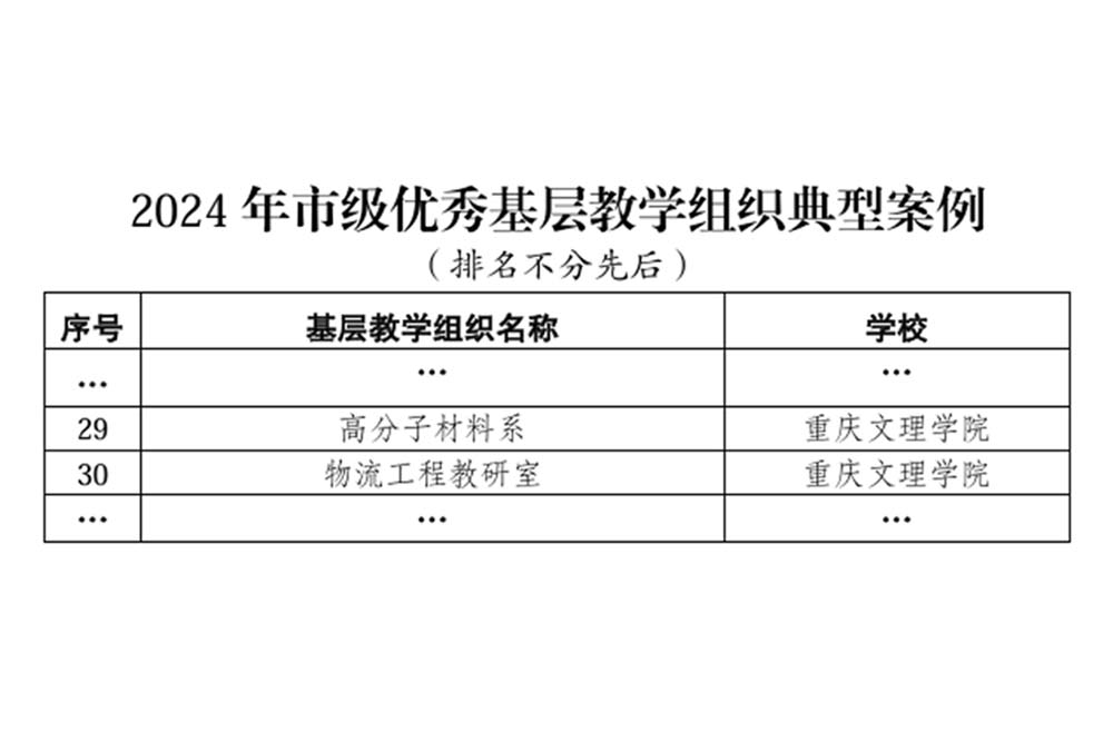 近日,重庆市教育委员会公布了2024年市级优秀基层教学组织典型案例评选结果,taptap点点高分子材料系和物流工程教研室获批优秀基层教学组织典型案例。目前,taptap点点已累计获批8个重庆市优秀基层教学组织典型案例和2个重庆市虚拟教研室。