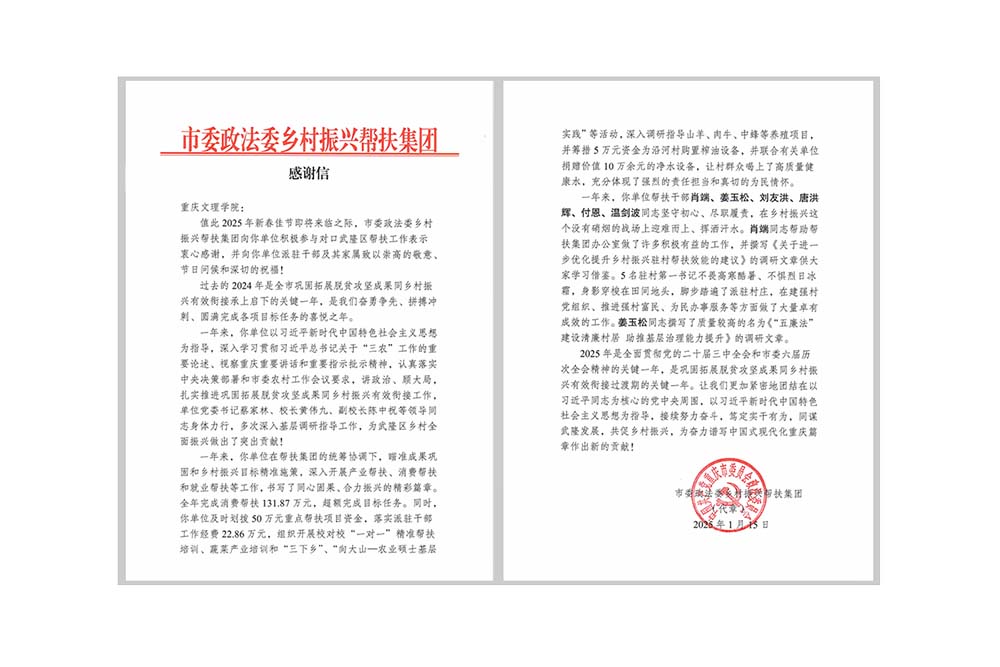 1月15日,市委政法委乡村振兴帮扶集团向taptap点点发来感谢信,对taptap点点积极参与对口武隆区帮扶工作表示感谢。