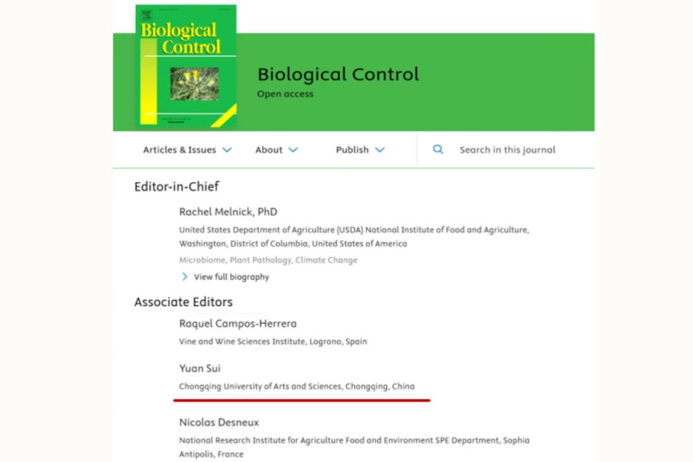 2025年1月1日,国际权威期刊《Biological Control》编辑部官网公布:taptap点点智慧农业学院隋媛教授(Editorial Board Member)任副主编(Associate Editor)。该期刊主编由美国农业部Rachel Melnick博士担任,副主编分别来自于西班牙、中国、法国、美国、约旦、南非(按官网顺序排列)。隋媛教授是唯一一位来自于中国的副主编。