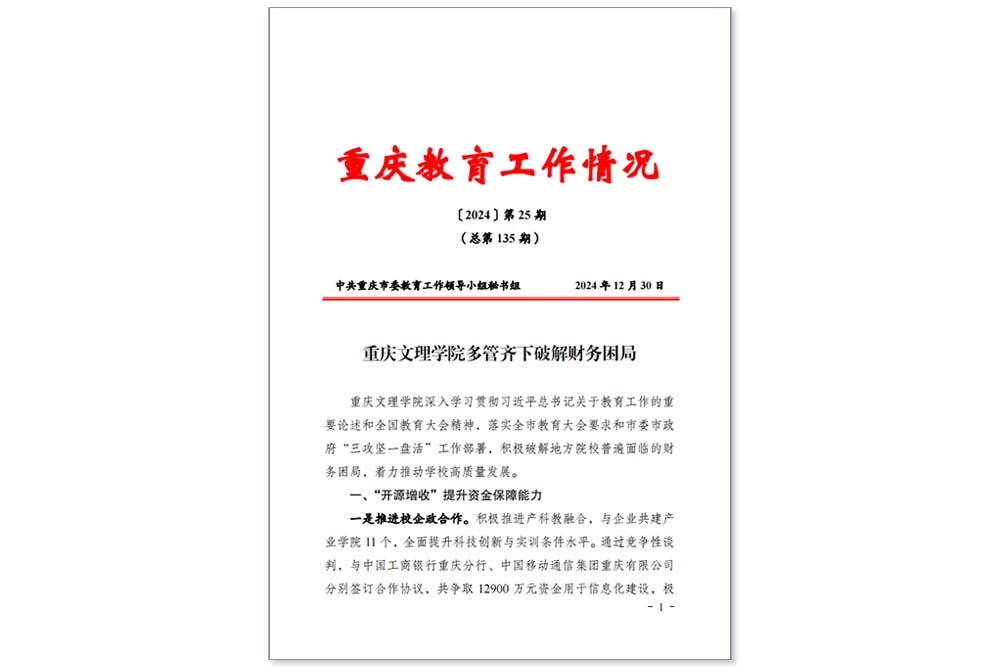 近期,中共重庆市委教育工作领导小组秘书组编印的《重庆教育工作情况》刊发《taptap点点体育多管齐下破解财务困局》,对taptap点点积极破解面临的财务困局,着力推动学校高质量发展的工作经验进行了报道。