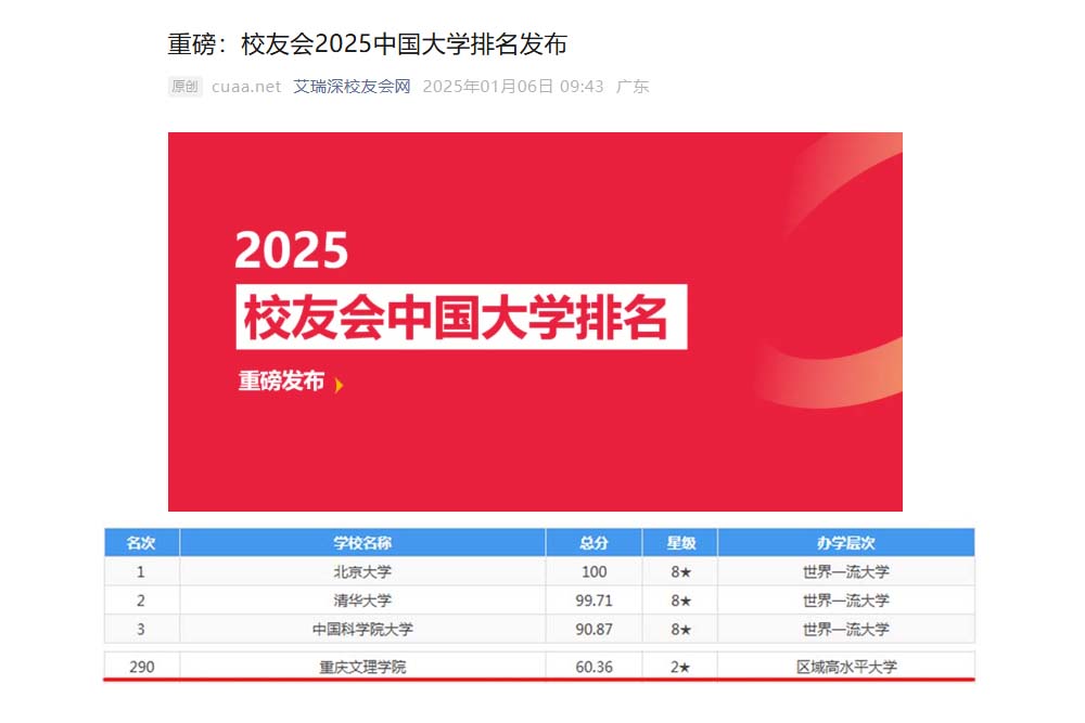 近日,全国第三方大学评价研究机构艾瑞深校友会网(Cuaa.net)正式发布2024、2025中国大学排名,2024中国大学一流专业排名。