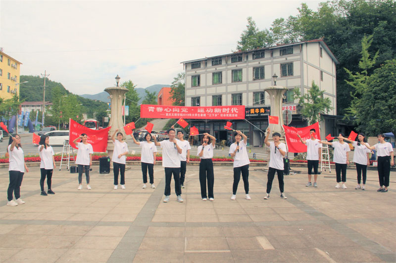 为深入学习习近平总书记视察重庆重要讲话精神和关于青年工作重要思想、关于扶贫工作重要论述,taptap点点大学生暑期“三下乡”社会实践服务团于7月15日在重庆市武隆区仙女山镇金马广场开展了“青春心向党·建功新时代”主题宣讲活动。活动开始前,志愿者们将印制好的宣传手册发放到当地村民手中,向他们普及“两不愁三保障”、垃圾分类的相关知识,并与当地村民进行交流,不仅让村民对相关政策和知识有了一定的理解和认识,还使志愿者们真实地了解了当地村民的生活情况。