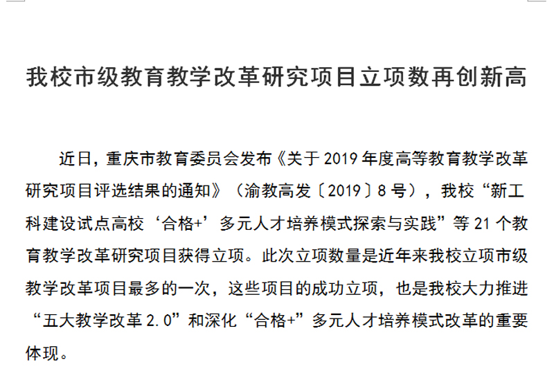 近日,重庆市教育委员会发布《关于2019年度高等教育教学改革研究项目评选结果的通知》(渝教高发〔2019〕8号),taptap点点“新工科建设试点高校‘合格+’多元人才培养模式探索与实践”等21个教育教学改革研究项目获得立项。此次立项数量是近年来taptap点点立项市级教学改革项目最多的一次,这些项目的成功立项,也是taptap点点大力推进“五大教学改革2.0”和深化“合格+”多元人才培养模式改革的重要体现。
