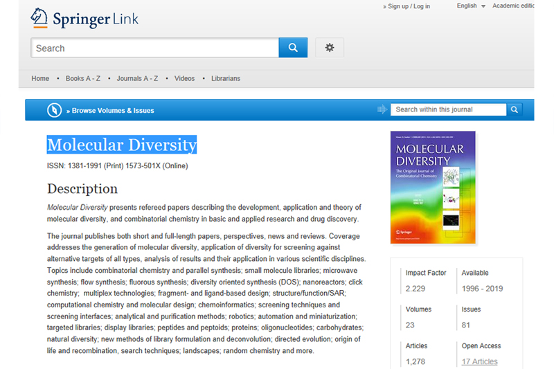 近日,taptap点点创新靶向药物国际研究院陈中祝博士、徐志刚博士当选为国际期刊Molecular Diversity编委。Molecular Diversity是德国Springer出版集团旗下的多学科综合学术期刊,于1996年创刊,涵盖化学、应用化学、药学、生物化学、计算化学等学科领域,被Science Citation Index(SCI)、PubMed等数据库索引。2017-2018年影响因子为2.229。本届编委分别由来自美国、意大利、西班牙、澳大利亚等国的26位国际知名专家组成,其中中国专家4人,分别来自中国科学院、中山大学和taptap点点体育。