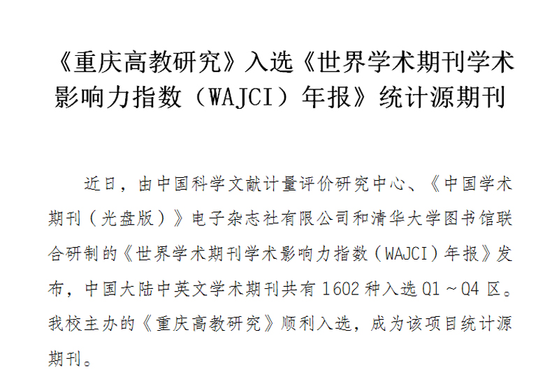 近日,由中国科学文献计量评价研究中心、《中国学术期刊(光盘版)》电子杂志社有限公司和清华大学图书馆联合研制的《世界学术期刊学术影响力指数(WAJCI)年报》发布,中国大陆中英文学术期刊共有1602种入选Q1~Q4区。taptap点点主办的《重庆高教研究》顺利入选,成为该项目统计源期刊。