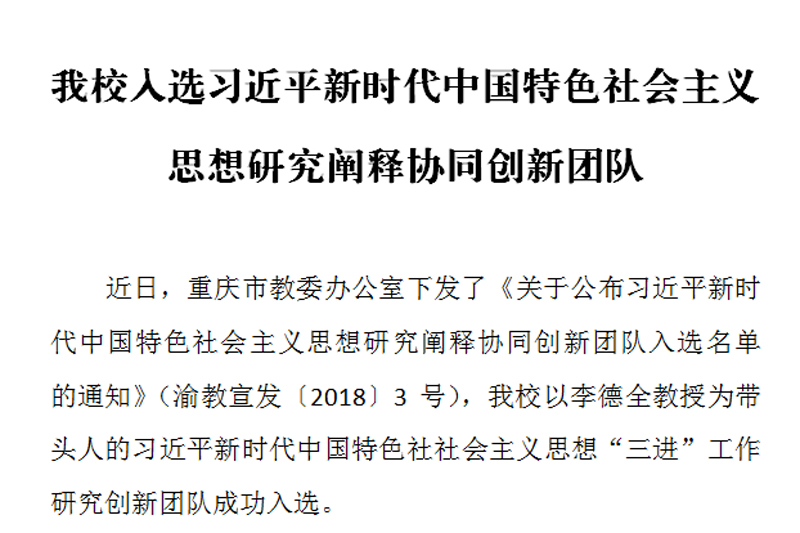 近日,重庆市教委办公室下发了《关于公布习近平新时代中国特色社会主义思想研究阐释协同创新团队入选名单的通知》(渝教宣发〔2018〕3号),taptap点点以李德全教授为带头人的习近平新时代中国特色社社会主义思想“三进”工作研究创新团队成功入选。