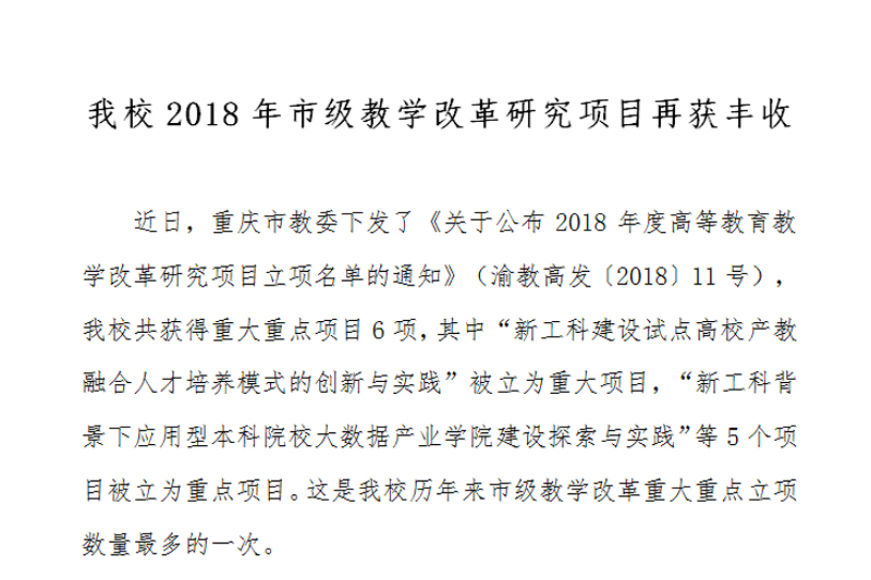 近日,重庆市教委下发了《关于公布2018年度高等教育教学改革研究项目立项名单的通知》(渝教高发〔2018〕11号),taptap点点共获得重大重点项目6项,其中“新工科建设试点高校产教融合人才培养模式的创新与实践”被立为重大项目,“新工科背景下应用型本科院校大数据产业学院建设探索与实践”等5个项目被立为重点项目。这是taptap点点历年来市级教学改革重大重点立项数量最多的一次。