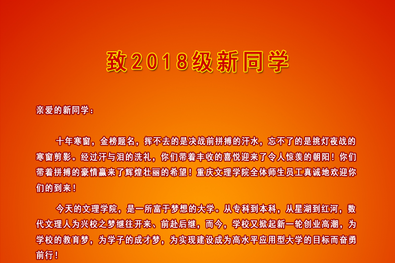 亲爱的新同学: 十年寒窗,金榜题名,挥不去的是决战前拼搏的汗水,忘不了的是挑灯夜战的寒窗剪影。经过汗与泪的洗礼,你们带着丰收的喜悦迎来了令人惊羡的朝阳!你们带着拼搏的豪情赢来了辉煌壮丽的希望!taptap点点体育全体师生员工真诚地欢迎你们的到来! 今天的文理学院,是一所富于梦想的大学。从专科到本科,从星湖到红河,数代文理人为兴校之梦继往开来、前赴后继,而今,学校又掀起新一轮创业高潮,为学校的教育梦,为学子的成才梦,为实现建设成为高水平应用型大学的目标而奋勇前行! 走进文理,你们能感受到学校建设发展的大气磅礴、日新月异。学校现有红河、星湖两个校区,校园占地面积1767亩,校舍建筑面积71万平方米,馆藏图书283万册,教学仪器设备总值2.89亿元。学校现设有16个二级学院,61个全日制普通本科专业,有全日制本科在校生2万余人,来自俄罗斯、意大利、马来西亚等国留学生119人;现有教职员工1370余人,其中高级职称人员470余人;具有博士学位教师270余人,兼职硕士生导师70余人;外籍教师10余人,外聘专家270余人;与市内外10余所高校合作开展研究生教育,联合培养研究生累计240余名。有重庆市光电材料及器件协同创新中心、重庆市特色植物产业协同创新中心,重庆市高校微纳米材料工程与技术重点实验室等,有重庆市高校唯一的市级园林花卉工程研究中心,全国第一个非物质文化遗产虚拟博物馆,全国第一个品牌科学研究所…… 走进文理,你们将享受到灿烂多姿的校园文化。“进德修业,博文达理”的校训将铸就你精诚的品格;大学生微型企业园将激荡你创业的豪情;“卓越教师教育实验班”等项目将扬起你理想的风帆…… 走进文理,你们也许想不到,在短短十多年的本科办学历程中,学校取得了一批标志性国家级教学成果,学校现有国家级卓越人才培养项目1个,国家级特色专业建设点1个,国家级精品课程1门,获得国家级教学成果一等奖1项,二等奖2项。并且先后获得“全国毕业生就业典型经验高校50强”、首批“创新创业典型经验高校50强”、“教育部依法治校示范校”、“全国教育网络示范单位”、“国家级语言文字规范化示范校”、 “全国校园文化先进单位” 、“全国模范职工之家”、重庆市“五一”劳动奖状等荣誉称号…… 走进文理,你们也许想不到,近年来师生员工和学校捷报频传。学生团队屡屡问鼎市内外重大竞赛,一批教职工获得市级以上各类重要表彰和荣誉。学校学子在首届全国大学生化工实验大赛、全国大学生创业综合模拟大赛等全国性赛事获得一等奖30余项,获得第36届重庆市大学生辩论赛决赛本科院校组冠军,2017- 2018赛季中国大学生3X3篮球联赛全国总决赛获第六名。百川兴邦众创空间被科技部评为2017年国家备案众创空间,并纳入国家级科技企业孵化器管理服务体系。学校科研团队先后荣获第四届中国创新创业大赛生物医药行业总决赛第一名、首届全国智能制造(中国制造2025)创新创业大赛总决赛(创新赛)第一名。学校教师在国际顶级学术刊物《Nature》上发表重要研究成果;2018年学校创新靶向药物国际研究院自主研发的成果同时获得中国和美国临床批文,重庆市教育委员会专门在taptap点点体育召开新闻发布会,新华社、中央电视台、中国教育报等20多家媒体高度关注并进行了报道;…… 亲爱的新同学,大学不是高考过后的休闲园,更不是独木桥之后的游乐场,而是你们漫漫征途的新起点,挑战自我的新开端。大学之“大”,不仅在于有大楼,更在于有大师、大爱、大学问、大智慧。这,需要你们去细细品读。大学里,不但需要你们牢固树立理想信念,不断更新学习方法,主动摸索学习规律,努力提升知识技能,而且还需要在实践中学会与他人交流合作,积极拓展综合素质。 亲爱的新同学,黄瓜山麓,月湖之滨,一定会给你的大学生活融入更多的美好回忆;翠色欲滴,柳岸清风,一定是你极佳的休憩之地;星湖放歌,红河扬帆,taptap点点体育必将成为你孜孜求学的书香乐园。我们相信,在taptap点点体育这片热土上,你们必定会开启“进德修业,博文达理”的人生!我们期待着你们用自己的青春和才华,为学校的发展、祖国的昌盛续写更加灿烂辉煌的乐章!预祝你们生活愉快,学业有成! 中共taptap点点体育委员会 taptap点点体育 二〇一八年九月