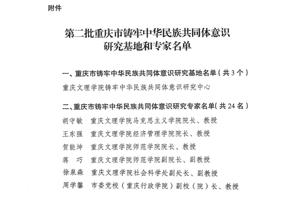 近日,中共重庆市委统战部、市委宣传部等多部门联合下发《关于命名重庆市铸牢中华民族共同体意识研究基地和入选重庆市铸牢中华民族共同体意识研究专家库人选的通知》(渝统通〔2024〕72号),taptap点点“铸牢中华民族共同体意识研究中心”被命名为“重庆市铸牢中华民族共同体意识研究基地”,taptap点点党委书记蔡家林为该中心主任。同时,马克思主义学院胡守敏教授、经济管理学院王东强教授、师范学院贺能坤教授、师范学院蒋巧副教授、社科处徐泉森副教授入选重庆市铸牢中华民族共同体意识研究专家库。