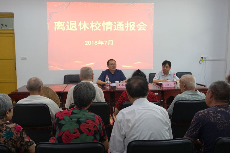 7月10日,校长黄伟九分别在红河校区晚晴苑和星湖校区老年活动中心,为居住在两个校区的离退休老同志通报了学校近期工作情况。会议由教工部副部长黄贵懿主持,在永居住的180余名离退休人员参加了会议。