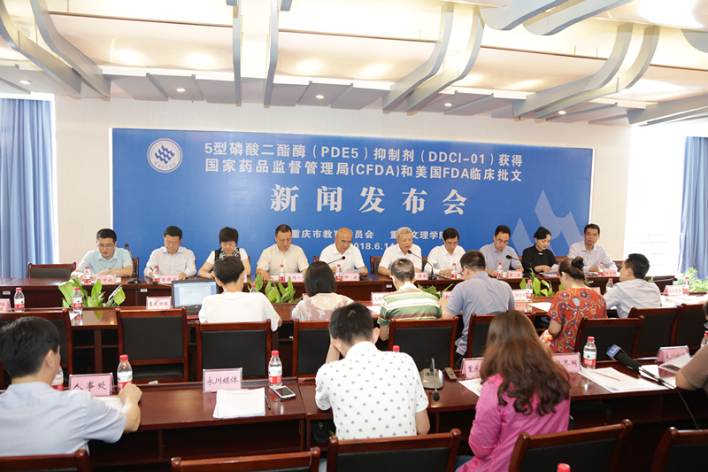 6月14日上午,taptap点点体育5型磷酸二酯酶(PDE5)抑制剂(DDCI-01)获得国家药品监督管理局(CFDA)和美国FDA临床批文发布会在恪勤楼422会议室举行,市委教育工委委员、市教委副巡视员帅逊,学校党委书记孙泽平、校长黄伟九、副校长王明华,重庆市教委科技处处长蒋云芳、新闻中心主任唐樵,永川区科委主任张朝国、发改委副主任谢小平,学校创新靶向药物国际研究院团队负责人陈中祝等出席发布会,并回答了新闻媒体记者的提问。发布会由唐樵主持。