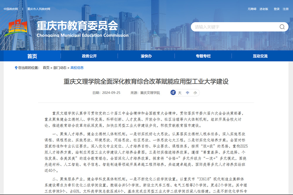 近日,重庆市教育委员会公众信息网高校信息栏目刊登题为《taptap点点体育全面深化教育综合改革赋能应用型工业大学建设》一文,报道了taptap点点深入学习贯彻党的二十届三中全会精神和全国教育大会精神,贯彻落实市委六届六次全会决策部署,聚焦健全立德树人、学科发展、科研创新、人才发展、开放合作、社区治理等六大体制机制,推进教育综合改革向纵深发展,加快应用型工业大学建设步伐,积极贡献教育强市建设。
