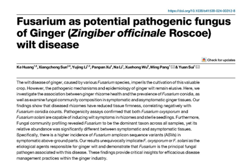 10月3日,taptap点点智慧农业学院隋媛教授带领的“果蔬病害绿色防控技术推广应用”团队在npj Science of Food(6.3,中科院农林科学1区)上发表研究论文"Fusarium as Potential Pathogenic Fungus of Ginger (Zingiber officinale Roscoe) Wilt Disease" ,黄科教授为第一作者。