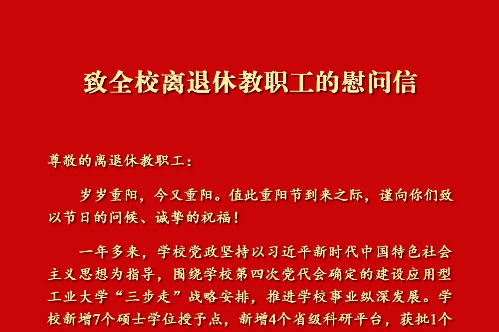 尊敬的离退休教职工: 岁岁重阳,今又重阳。值此重阳节到来之际,谨向你们致以节日的问候、诚挚的祝福! 一年多来,学校党政坚持以习近平新时代中国特色社会主义思想为指导,围绕学校第四次党代会确定的建设应用型工业大学“三步走”战略安排,推进学校事业纵深发展。学校新增7个硕士学位授予点,新增4个省级科研平台,获批1个重庆市普通本科高校产教融合特色优势专业群、2项“本科教学成果培育揭榜挂帅”专项项目,首次获得教育部高等学校科学研究优秀成果奖二等奖,7名学者入选全球前2%顶尖科学家;新生一本线上录取占51.5%,2024届毕业生初次去向落实率达到89.7%;学生社区治理工作受到主流媒体广泛报道,赢得社会高度评价;荣获“重庆市乡村振兴贡献奖先进集体”称号,老教师合唱团在重庆首届中老年合唱展演中斩获四大奖项。市委书记袁家军深入学校调研,对学校的办学成绩和发展方向给予充分肯定。 缘木思本,饮水思源。在过去的岁月里,你们以无私奉献和辛勤耕耘为教育事业躬耕奉献,为学校的建设与发展奠定了坚实的基础。如今,你们虽已离开工作岗位,但仍心系学校发展、关心学生成长,积极为学校的改革与发展建言献策。你们的付出与贡献,将永远镌刻在学校事业发展的丰碑上。 莫道桑榆晚,为霞尚满天。我们真切期望你们继续关心支持学校工作,为建设应用型工业大学贡献智慧和力量。 祝愿全校离退休教职工身体健康、心情舒畅! 中共taptap点点体育委员会 taptap点点体育 2024年10月11日