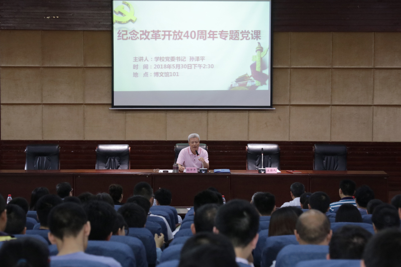 5月30日下午,学校党委书记孙泽平深入基层开展以“纪念改革开放40周年”为主题的专题党课。机关第一党总支、外国语学院党总支、机电工程学院党总支全体教师、学生党员共计200余人参加了党课。党课由机关第一党总支书记余泽标主持。