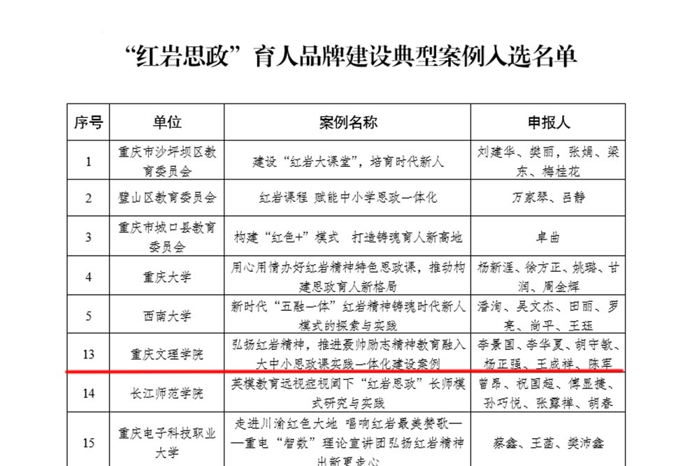 近日,中共重庆市委教育工作委员会办公室发文公布了“红岩思政”育人品牌建设典型案例入选名单,taptap点点联合taptap点点体育附属中学、永川区三官殿小学申报的典型案例《弘扬红岩精神,推进聂帅励志精神教育融入大中小思政课实践一体化建设》(申报人:李景国、李华夏、胡守敏、杨正强、王成祥、陈军)成功入选。