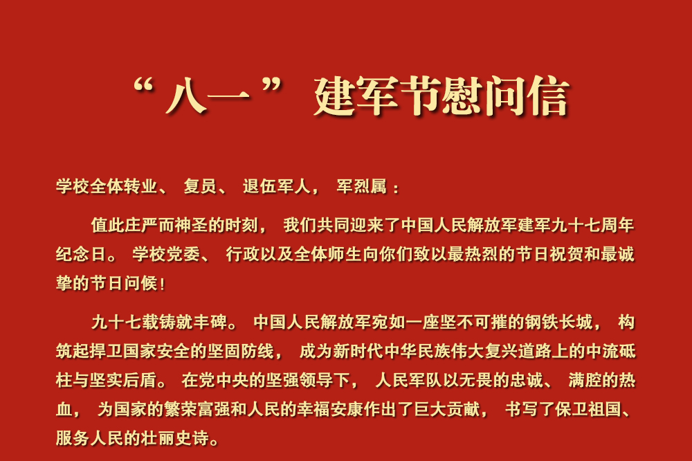 在中国人民解放军建军97周年来临之际,学校党委副书记祝朝伟带领党委教师工作部(人事处)负责人,深入开展了退役军人及军属走访慰问活动,带去了学校对他们的深切关怀与崇高敬意。