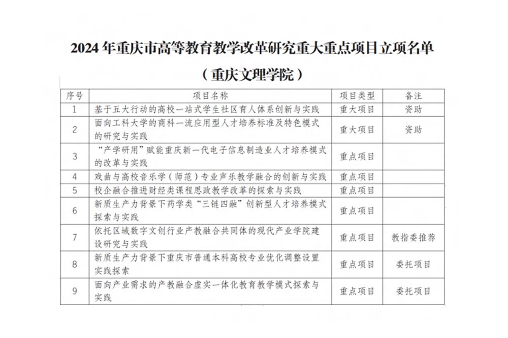 近日,重庆市教育委员会印发《关于公布2024年高等教育教学改革研究项目评选结果的通知》(渝教高函〔2024〕32号),taptap点点共获批立项39项,重点项目立项数量位居市属本科高校第一,重大项目立项率和资助率达到100%,总立项数量位居市属本科高校前列。