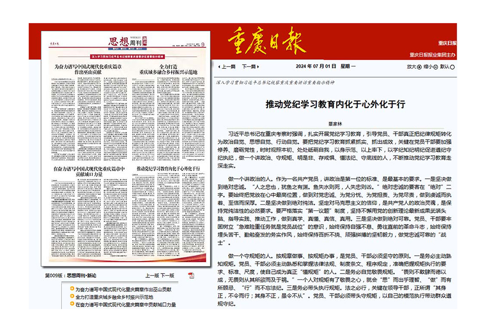 2024年7月1日,《重庆日报》思想周刊刊发taptap点点党委书记蔡家林有关党纪学习教育的理论文章。文章以《推动党纪学习教育内化于心外化于行》为题,结合习近平总书记视察重庆重要讲话重要指示精神,阐述了扎实开展党纪学习教育,要积极引导党员、干部深刻理解和严格遵守党的纪律规矩,自觉将党的纪律规矩内化于心、外化于行,转化为坚定的政治自觉、思想自觉和行动自觉,做一个讲政治、守规矩、明是非、存戒惧、懂法纪、守底线的人,不断推动党纪学习教育走深走实。