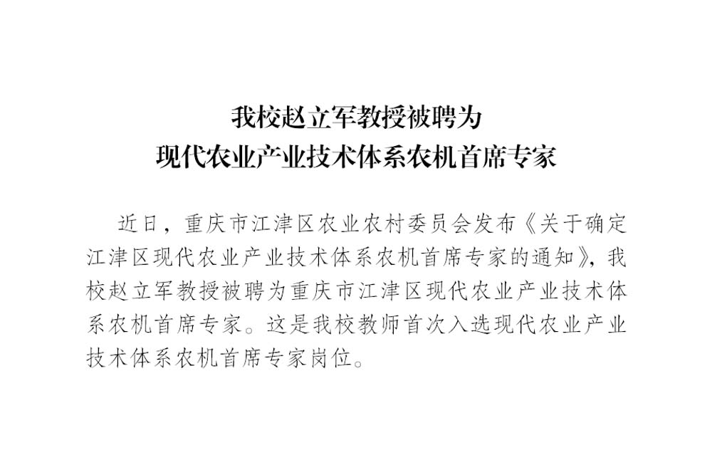 近日,重庆市江津区农业农村委员会发布《关于确定江津区现代农业产业技术体系农机首席专家的通知》,taptap点点赵立军教授被聘为重庆市江津区现代农业产业技术体系农机首席专家。这是taptap点点教师首次入选现代农业产业技术体系农机首席专家岗位。