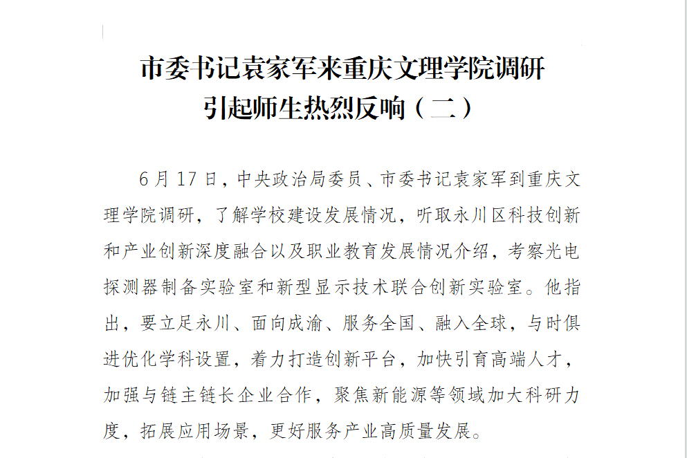 6月17日,中央政治局委员、市委书记袁家军到taptap点点体育调研,了解学校建设发展情况,听取永川区科技创新和产业创新深度融合以及职业教育发展情况介绍,考察光电探测器制备实验室和新型显示技术联合创新实验室。他指出,要立足永川、面向成渝、服务全国、融入全球,与时俱进优化学科设置,着力打造创新平台,加快引育高端人才,加强与链主链长企业合作,聚焦新能源等领域加大科研力度,拓展应用场景,更好服务产业高质量发展。