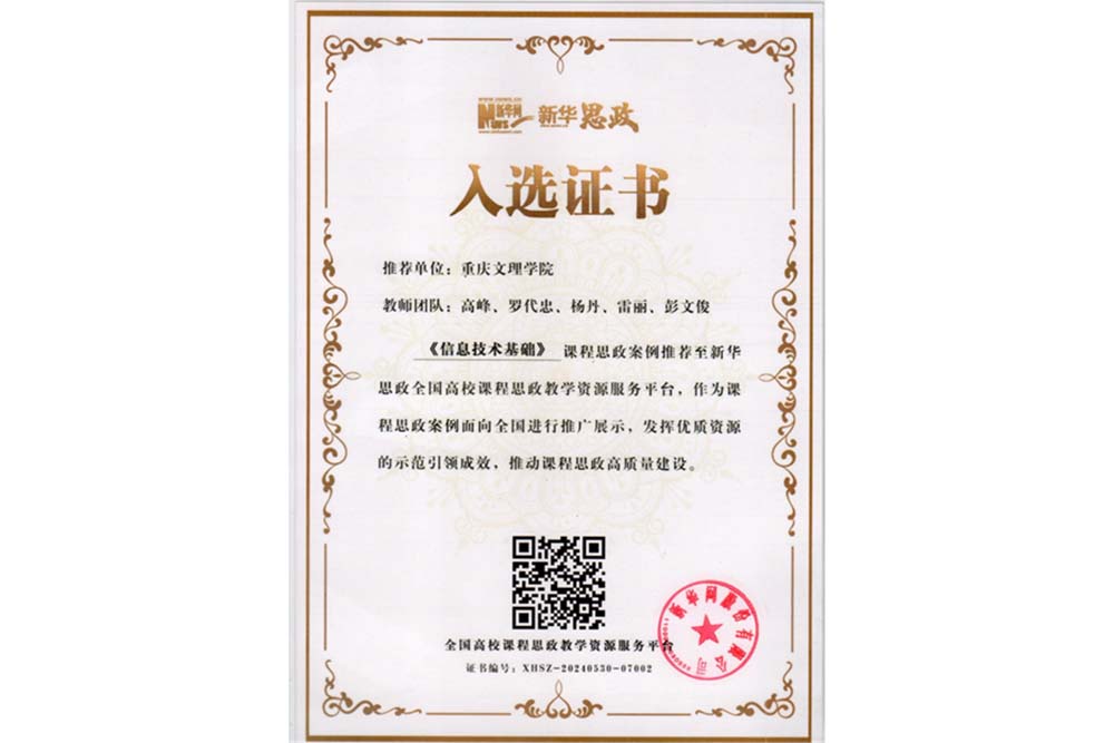 近日,数学与人工智能学院高峰、罗代忠、杨丹等教师团队编写的《信息技术基础》课程思政教学案例入选新华网“新华思政”平台,面向全社会开放共享教学设计、教学视频、教学课件、说课视频等教学资源。