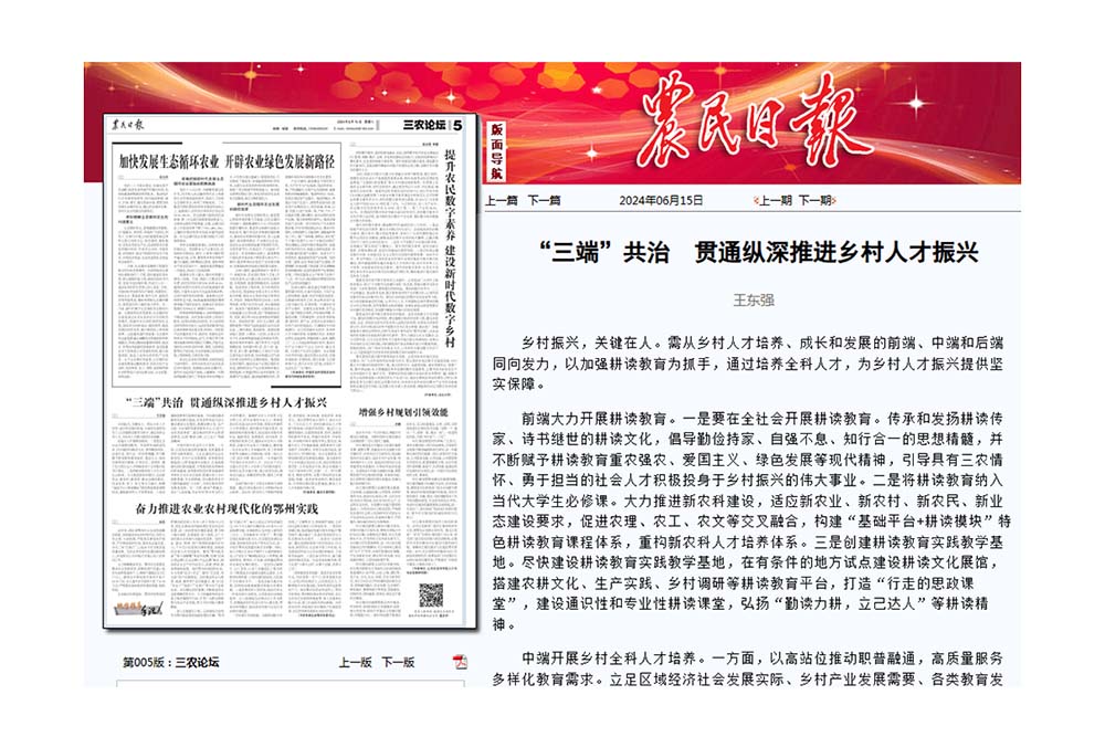 6月15日,taptap点点经济管理学院王东强教授在《农民日报》理论版“三农论坛”发表了题为《“三端”共治 贯通纵深推进乡村人才振兴》理论文章。论文刊发后得到中国农网、新浪等媒体全文转载。《农民日报》由农业农村部主管,是中央主要新闻单位之一,是一份中央级、综合性报刊,主要履行党和政府指导全国农业和农村工作重要舆论工具的职能。