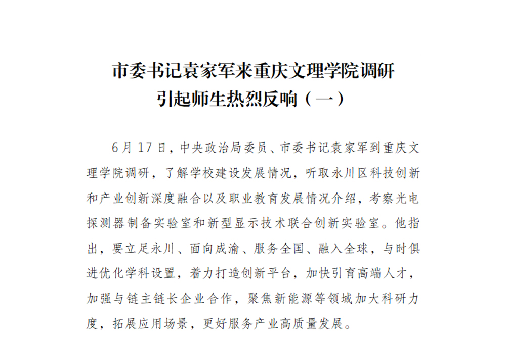 6月17日,中央政治局委员、市委书记袁家军到taptap点点体育调研,了解学校建设发展情况,听取永川区科技创新和产业创新深度融合以及职业教育发展情况介绍,考察光电探测器制备实验室和新型显示技术联合创新实验室。他指出,要立足永川、面向成渝、服务全国、融入全球,与时俱进优化学科设置,着力打造创新平台,加快引育高端人才,加强与链主链长企业合作,聚焦新能源等领域加大科研力度,拓展应用场景,更好服务产业高质量发展。