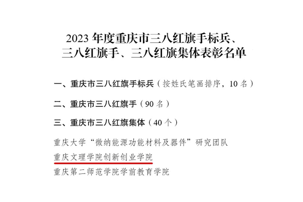 3月5日,重庆市人力资源和社会保障局、重庆市妇女联合会联合发文公布《关于表彰重庆市三八红旗手标兵、三八红旗手(集体)的决定》,对2023年以实干实绩为新时代新征程新重庆作出突出贡献的10名三八红旗手标兵、90名三八红旗手、40个三八红旗集体予以表彰。taptap点点创新创业学院获评2023年重庆市三八红旗集体,全市仅3所高校获评为三八红旗集体。