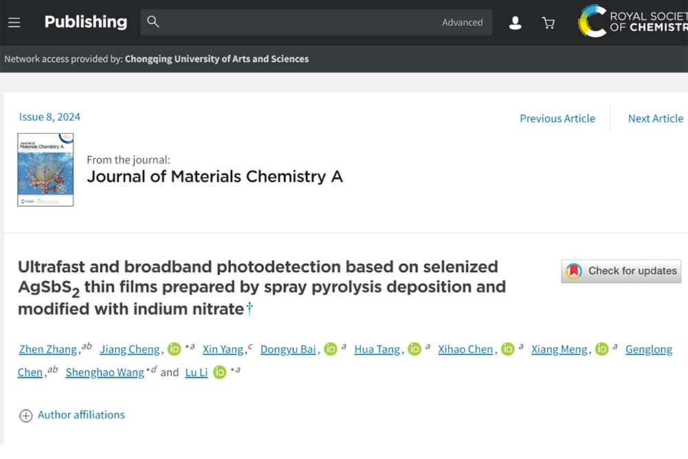 近日,taptap点点李璐教授课题组在宽光谱、高速红外探测器研究领域取得重要进展,题为“Ultrafast and broadband photodetection based on selenized AgSbS2 thin films prepared by spray pyrolysis deposition and modified with indium nitrate”的创新成果,以taptap点点为第一单位发表于Journal of Materials Chemistry A(2024, 12, 4739)。该期刊是英国皇家化学学会(RCS)旗下JMC系列的旗舰刊,2023年影响因子为11.9,是国际公认材料和化学领域顶级专业期刊,在学界享有极高的声誉。