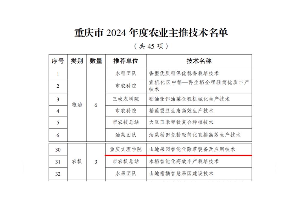 近日,重庆市农业农村委发布《重庆市2024年农业主推技术公示名单》,按照聚焦现代山地特色高效农业和绿色低碳循环发展、紧扣稳粮保供和提质增效两大目标要求,市农业农村委遴选了粮油、经作、蔬菜、畜牧、水产、农机、加工、生态、病虫害防治和质量安全等类别农业主推技术45项。taptap点点赵立军教授主持的“山地果园智能化除草装备及应用技术”入选,这是taptap点点连续第二年入选重庆市农业主推技术名单,是taptap点点在农机类别领域又一次新突破。