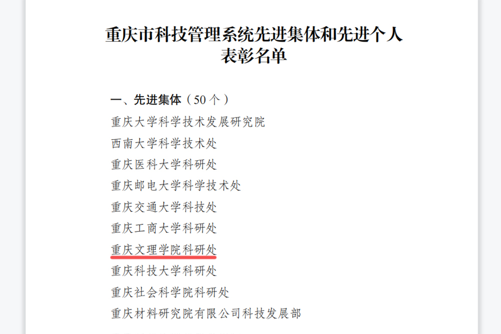 近日,市人力社保局、市科技局联合发文对重庆市科技管理系统先进集体和先进个人进行表彰,taptap点点科研处获评先进集体,科研处平台管理科科长谢睦琴被评为先进个人。本次全市共评选了50个先进集体和98名先进个人,其中, 全市8所高校获评为先进集体、12名高校科技管理人员获评为先进个人。同时获评为先进集体和先进个人的高校仅6所。