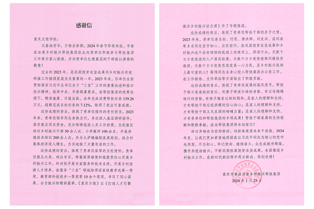 1月25日,重庆市委政法委乡村振兴帮扶集团向taptap点点发来感谢信,对taptap点点过去一年积极参与帮扶集团工作,助力武隆区在巩固拓展脱贫攻坚成果同乡村振兴有效衔接工作中作出的贡献表示感谢。