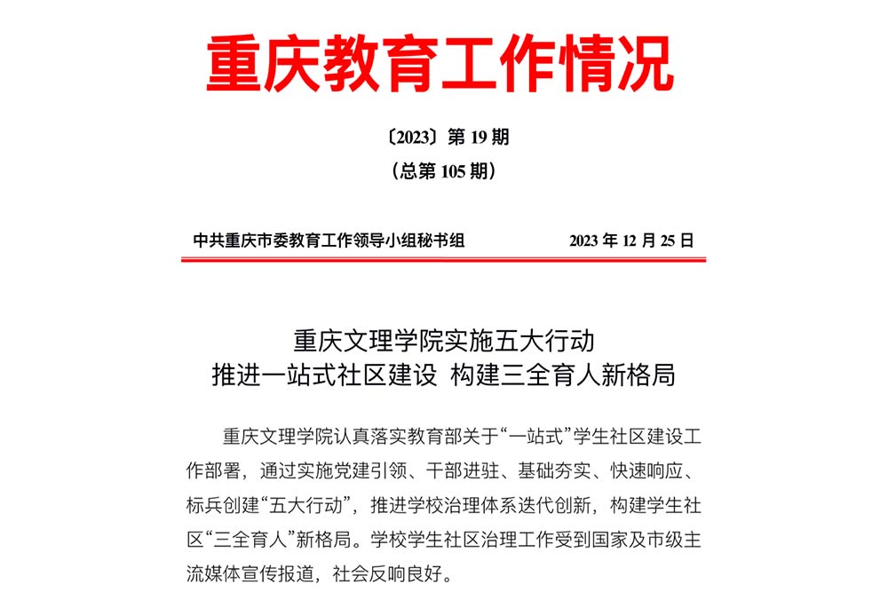 2023年12月25日,中共重庆市委教育工作领导小组秘书组编印的《重庆教育工作情况》以“taptap点点体育实施五大行动推进一站式社区建设 构建三全育人新格局”,专题报道了taptap点点一站式社区建设工作。文章报道了taptap点点开展的党建引领行动、干部进驻行动、基础夯实行动、快速响应行动、标兵创建行动等“五大行动”的典型做法,为推动高校学生社区治理工作提供了文理范式。据了解,《重庆教育工作情况》将分送中央教育工作领导小组秘书组,市委教育工作领导小组组长、副组长、成员单位,各区县党委教育工作领导小组及其秘书组,各高校党委等单位。