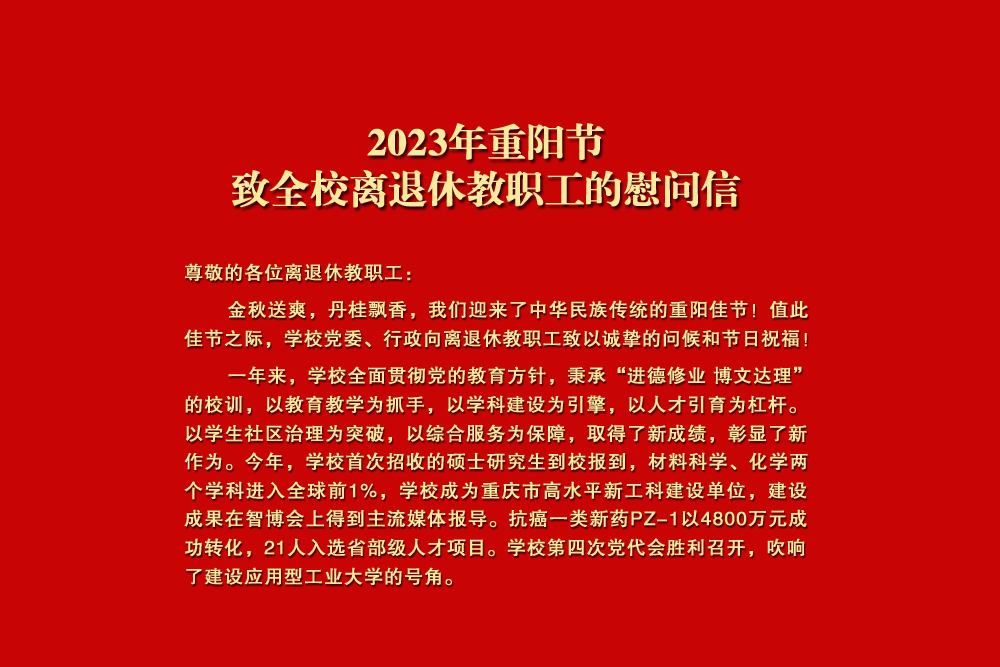 尊敬的各位离退休教职工: 金秋送爽,丹桂飘香,我们迎来了中华民族传统的重阳佳节!值此佳节之际,学校党委、行政向离退休教职工致以诚挚的问候和节日祝福! 一年来,学校全面贯彻党的教育方针,秉承“进德修业 博文达理”的校训,以教育教学为抓手,以学科建设为引擎,以人才引育为杠杆。以学生社区治理为突破,以综合服务为保障,取得了新成绩,彰显了新作为。今年,学校首次招收的硕士研究生到校报到,材料科学、化学两个学科进入全球前1%,学校成为重庆市高水平新工科建设单位,建设成果在智博会上得到主流媒体报导。抗癌一类新药PZ-1以4800万元成功转化,21人入选省部级人才项目。学校第四次党代会胜利召开,吹响了建设应用型工业大学的号角。 万丈高楼起于垒土,参天大厦始于地基。学校事业蒸蒸日上,饱含着你们“功成不必在我”的无私奉献、“功成必定有我”的无畏担当。你们为学校的建设和发展奉献了青春、热血和汗水,铺就了学校发展的基石,为学校今天的累累硕果奠定了基础,你们的使命感、责任感和无私奉献精神,是我们最宝贵的财富! 霞披夕阳情无限,霜染秋枫叶正红。全校正深入贯彻落实学校第四次党代会精神,勠力同心建设应用型工业大学。我们热切期盼广大离退休教职工一如既往地关心、支持学校的工作,继续为学校的发展献计献策,继续在学校改革、发展、稳定中发挥重要作用,共同谱写学校更加美好的明天。 衷心祝愿全校离退休老同志重阳节快乐、阖家幸福、身体健康、万事如意! 中共taptap点点体育委员会 taptap点点体育 2023年10月23日
