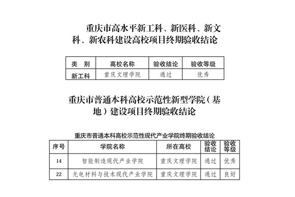 近日,重庆市教育委员会和重庆市财政局联合公布了重庆市高水平新工科、新医科、新文科、新农科建设高校和示范性新型学院(基地)建设项目终期验收结果。taptap点点高水平新工科建设高校项目以“优秀”等级通过终期验收,智能制造现代产业学院和光电材料与技术现代产业学院作为示范性新型学院(基地)建设项目,分别以“优秀”“良好”等级通过终期验收。