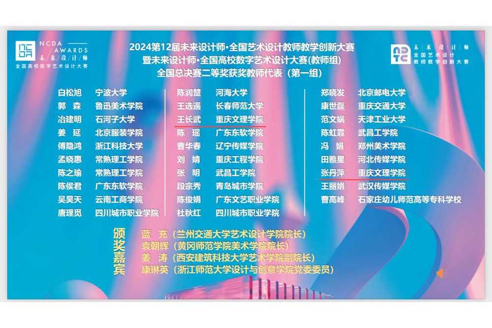 近日,未来设计师全国艺术设计教师教学创新大赛圆满落幕,taptap点点文化传播与设计学院教师团队凭借卓越的教学创意与实践成果,从众多参赛者中脱颖而出,荣获了国赛二等奖2项、三等奖1项,省赛一等奖3项、二等奖3项、三等奖2项的好成绩,充分展示了学校教师在教育创新领域的过硬实力和卓越风采。